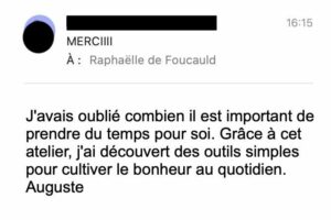 En plus de mon travail de thérapeute, je partage régulièrement mes conseils à travers des conférences et des formations. Je suis également la voix derrière le podcast « Bulle de Bonheur », un espace où je vous livre des astuces pour prendre le temps d’être heureux.