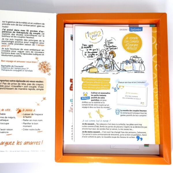 Une des clés des couples heureux est de passer des temps de qualité à deux, loin des écrans et du tourbillon du quotidien. Les livrets créés avec cet objectif par la thérapeute de couple Raphaëlle de Foucauld et basés sur la psychologie positive font de ce coffret couple 1 temps pour 2® un outil sérieux, riche de sens et ludique. Tout est réuni pour rendre votre couple heureux !