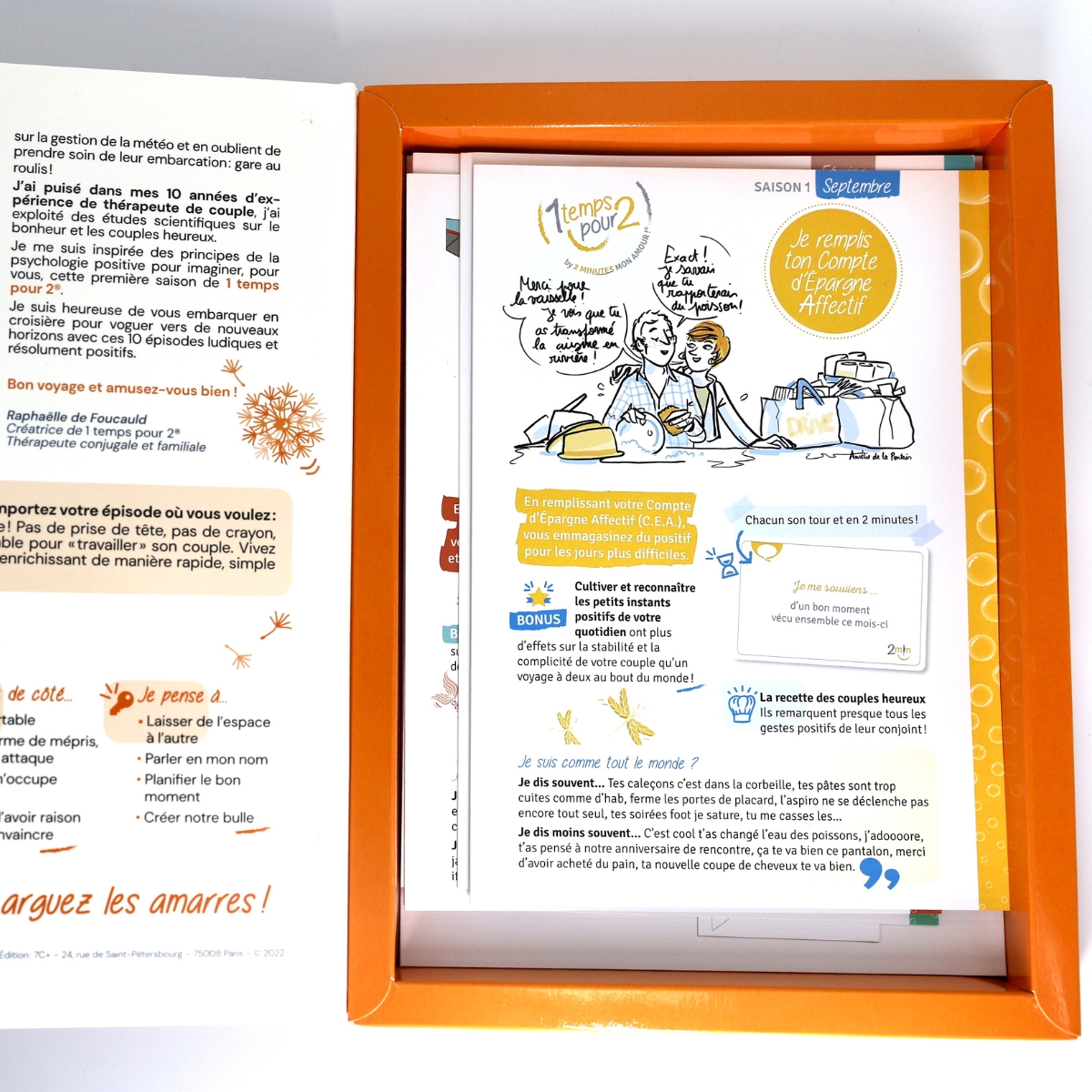 Le coffret couple 1 temps pour 2® est le 1er coffret ludique et enrichissant pour accompagner les couples à solidifier leur relation. Les livrets 1 temps pour 2® créent un état d’esprit positif dans le quotidien des couples. Les livrets conçus par une thérapeute sont riches de contenus variés et ludiques. Chaque livret offre une pause au couple pour savourer la joie de vivre à deux, prendre conscience de ses forces et de ses valeurs.