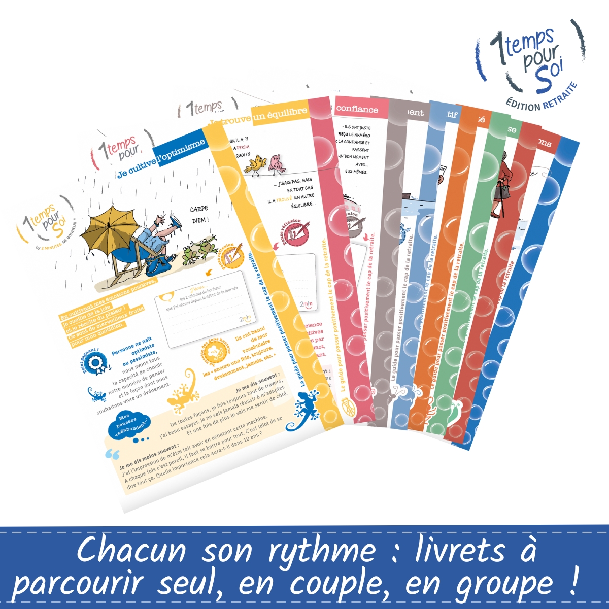 Les livrets retraite qui boostent l’estime de soi, qui permettent de prendre conscience de ses talents, de donner un nouveau sens à son quotidien et qui créent des envies et des défis. Les tester c’est les adopter et les recommander !Soutien psychologique pour les transitions de vie-2 minutes de bonheur