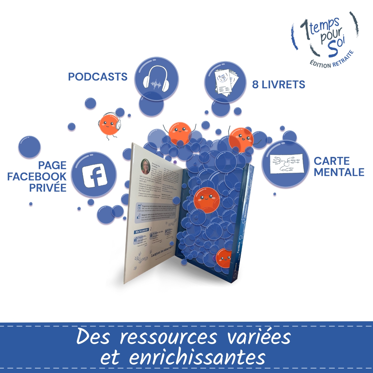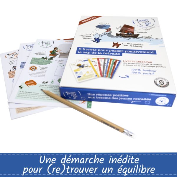 Le coffret retraite 1 temps pour Soi® est un accompagnement inspirant et enrichissant pour passer le cap de la retraite.  Les livrets de 1 temps pour Soi® créent ainsi un état d’esprit positif. Les livrets conçus par une thérapeute sont riches de contenus variés et ludiques. Chaque livret offre une pause pour se ressourcer, prendre conscience de ses talents et les mettre au service de cette nouvelle vie !