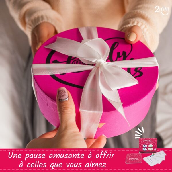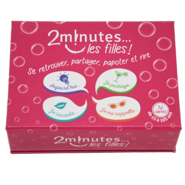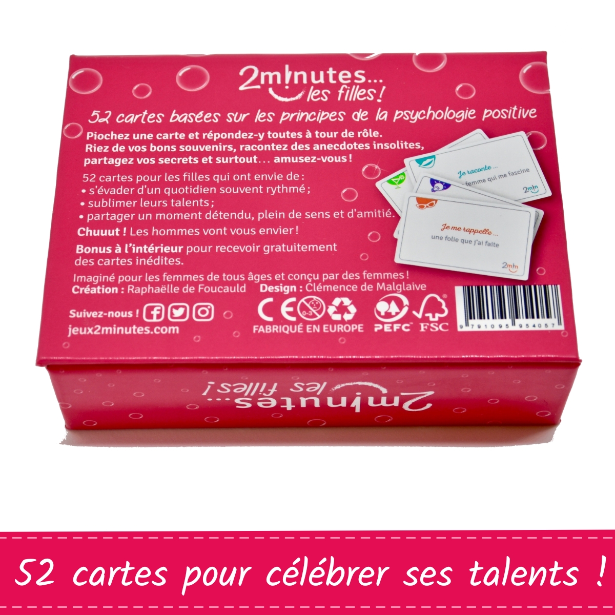 UTILISABLE PARTOUT : 2 minutes les filles ! ® est un jeu de 52 cartes qui vous accompagne partout. Au restaurant, en voiture, pendant une soirée entre filles, mère-fille ou un EVJF. Un bon moyen de vivre un temps positif.