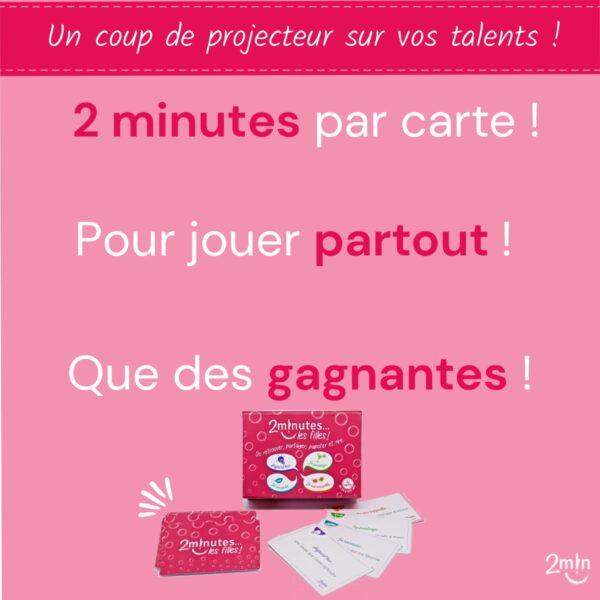 Le tester c’est l’adopter ! 2 minutes les filles deviendra vite un jeu incontournable de vos soirées ou de vos EVJF et promet de l’originalité à chaque carte tirée !