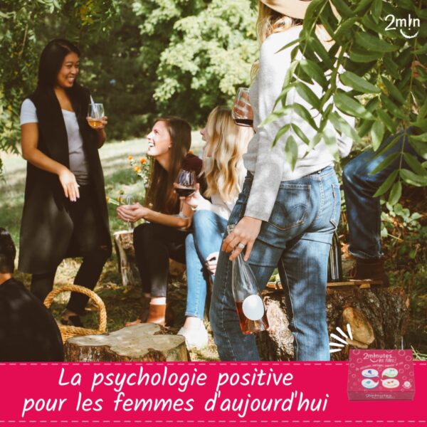 L’organisation familiale est souvent un poids invisible. En diminuant cette charge mentale, les femmes augmentent leur confiance en elles. L’un des meilleurs remèdes pour favoriser le lâcher prise est un bon moment entre amies ! Le jeu de cartes créées avec cet objectif par la thérapeute Raphaëlle de Foucauld et basées sur la psychologie positive font de 2 minutes les filles ! ® un jeu riche de sens et amusant. Il est accessible à tous grâce à son côté ludique.