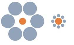En fait, ce sont les cercles gris qui servent de point de référence. Quand vous regardez le cercle orange entouré des petits, vous pensez que ce cercle doit être super grand, parce que tous ces cercles gris autour sont petits. Et puis quand vous regardez l’autre cercle orange, vous pensez que ce cercle orange est vraiment minuscule, parce vous le comparez aux autres cercles plus grands.